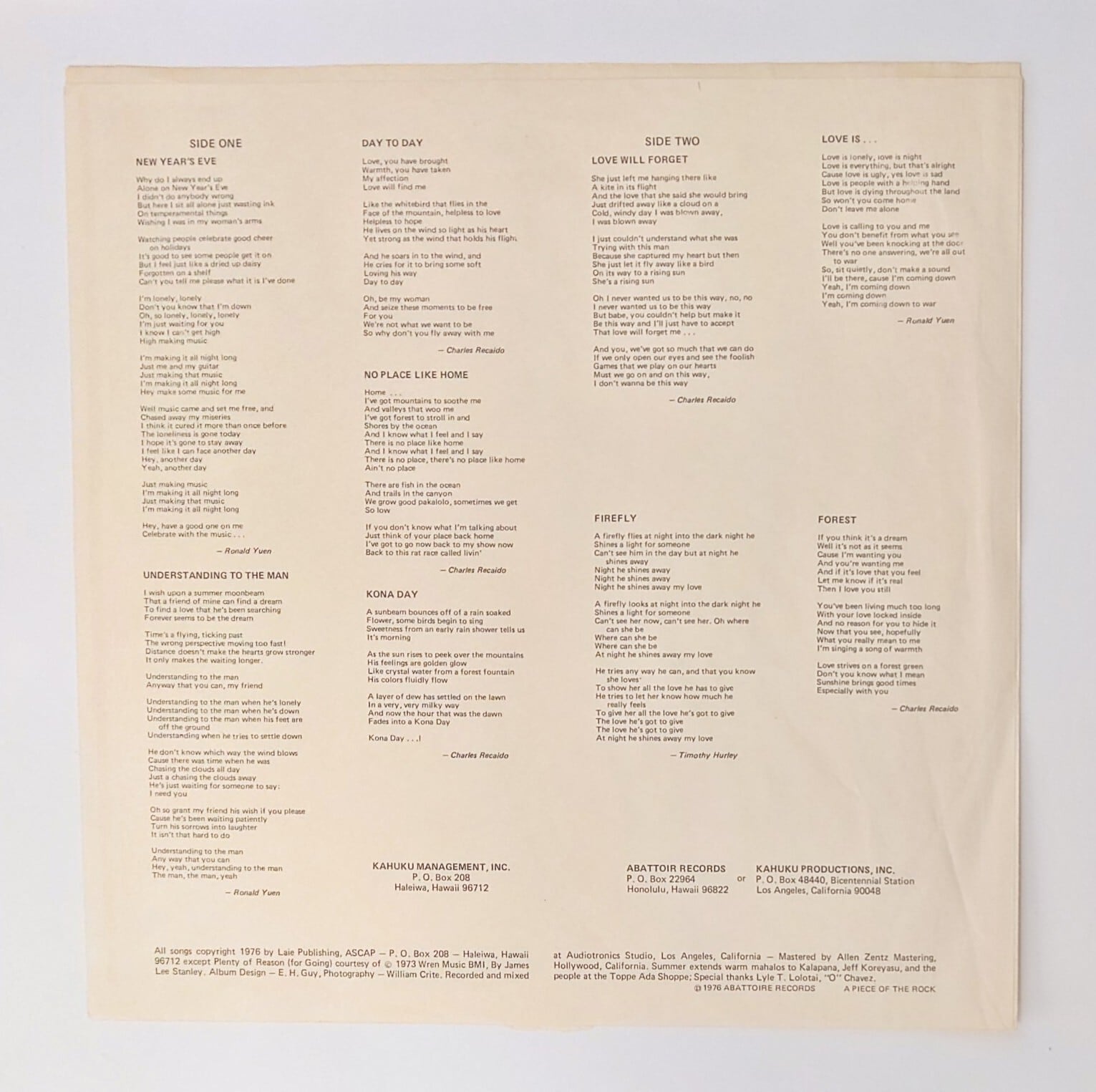 Summer extends warm mahalos to Kalapana, Jeff Koreyasu, and the people at the Toppe Ada Shoppe; Special thanks Lyle T. Lolotai, "O" Chavez.