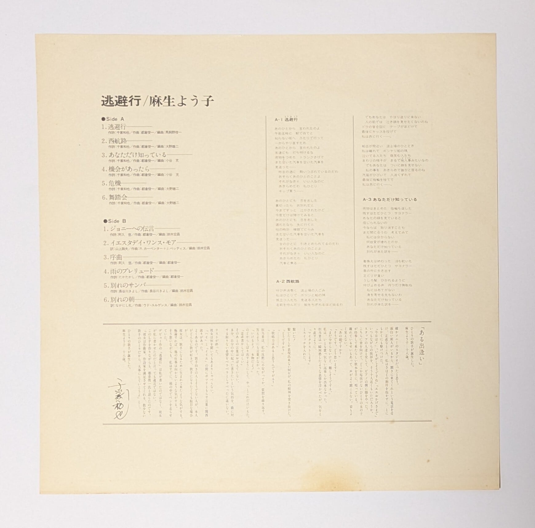 Yoko Aso 麻生よう子 - Tōhikō 逃避行 JPNオリジナル中古アナログ・レコード