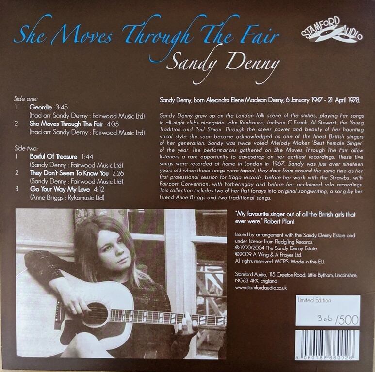 The performances gathered on She Moves Through The Fair allow listeners a rare opportunity to eavesdrop on her earliest recordings. These five songs were recorded at home in London in 1967. Sandy was just over nineteen years old when these songs were taped.