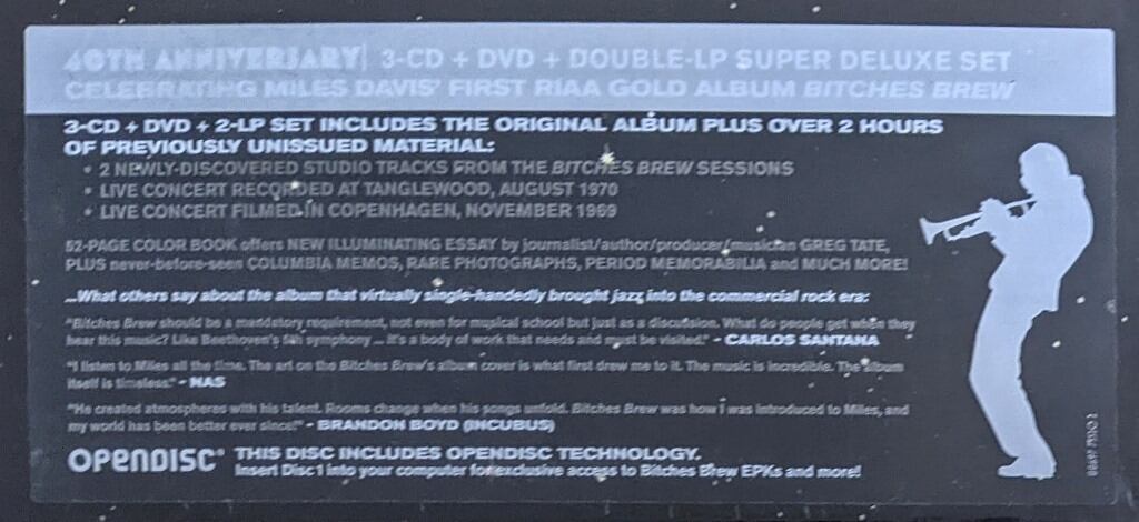 Includes a 52-page color 31,2 cm x 31,2 cm booklet with texts on the history of "Bitches Brew", producer's note, original album notes, photographs, original documents, like concert poster photo and letters, and several illustrations.